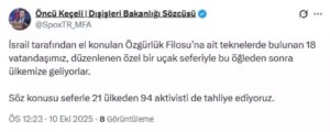 Dışişleri Bakanlığı Sözcüsü Öncü Keçeli, İsrail tarafından alıkonulan 18 Türk vatandaşının özel uçakla yurda getirileceğini açıkladı. Aynı seferde 21 ülkeden 94 aktivistin de tahliyesi gerçekleşiyor.